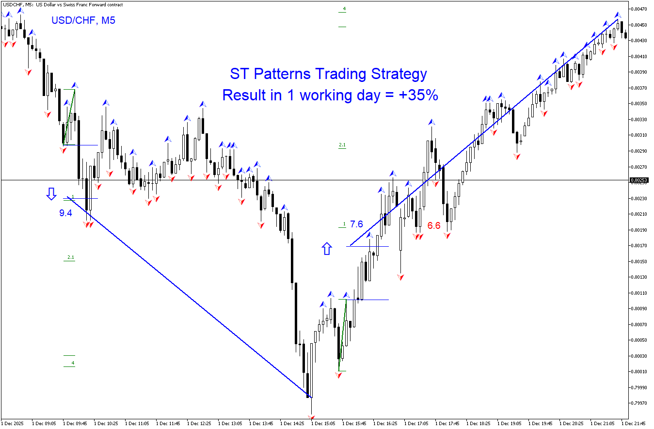 The chart shows an example of the STP strategy's performance on a random day, December 1, 2025. Breakout value = 6.7 pips. Result = 35% of the deposit. Eight years after its publication, the strategy continues to perform successfully!